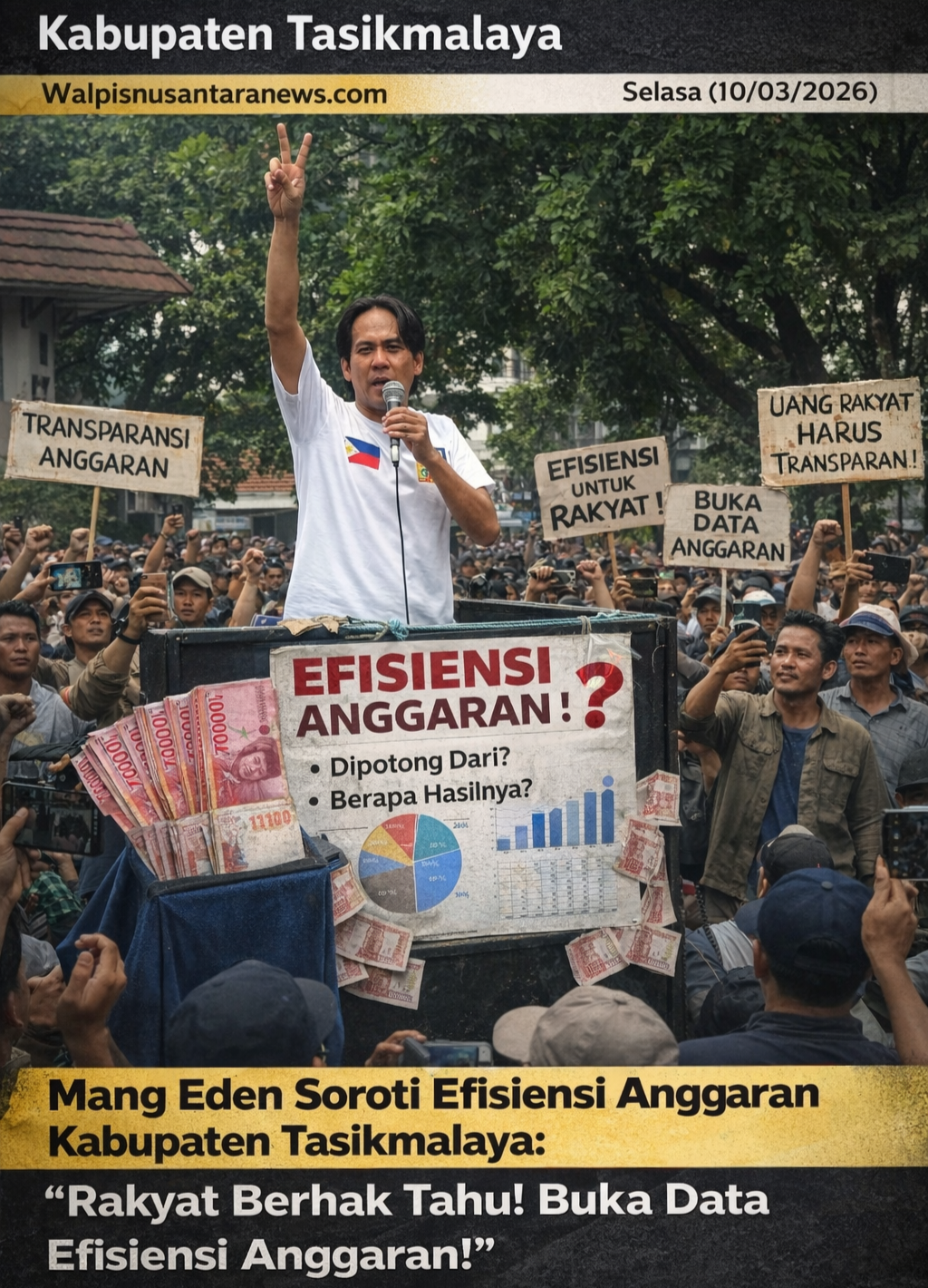Kabupaten Tasikmalaya, Walpisnusantaranews.com – Aroma ketidaktransparanan dalam kebijakan “efisiensi anggaran” kembali menjadi sorotan tajam. Pemerhati politik Tasikmalaya yang akrab disapa Mang Eden menilai kebijakan efisiensi yang kerap dijadikan alasan oleh pemerintah daerah justru menyisakan banyak pertanyaan yang hingga kini belum terjawab secara terbuka kepada publik. Selasa (10/03/2026)