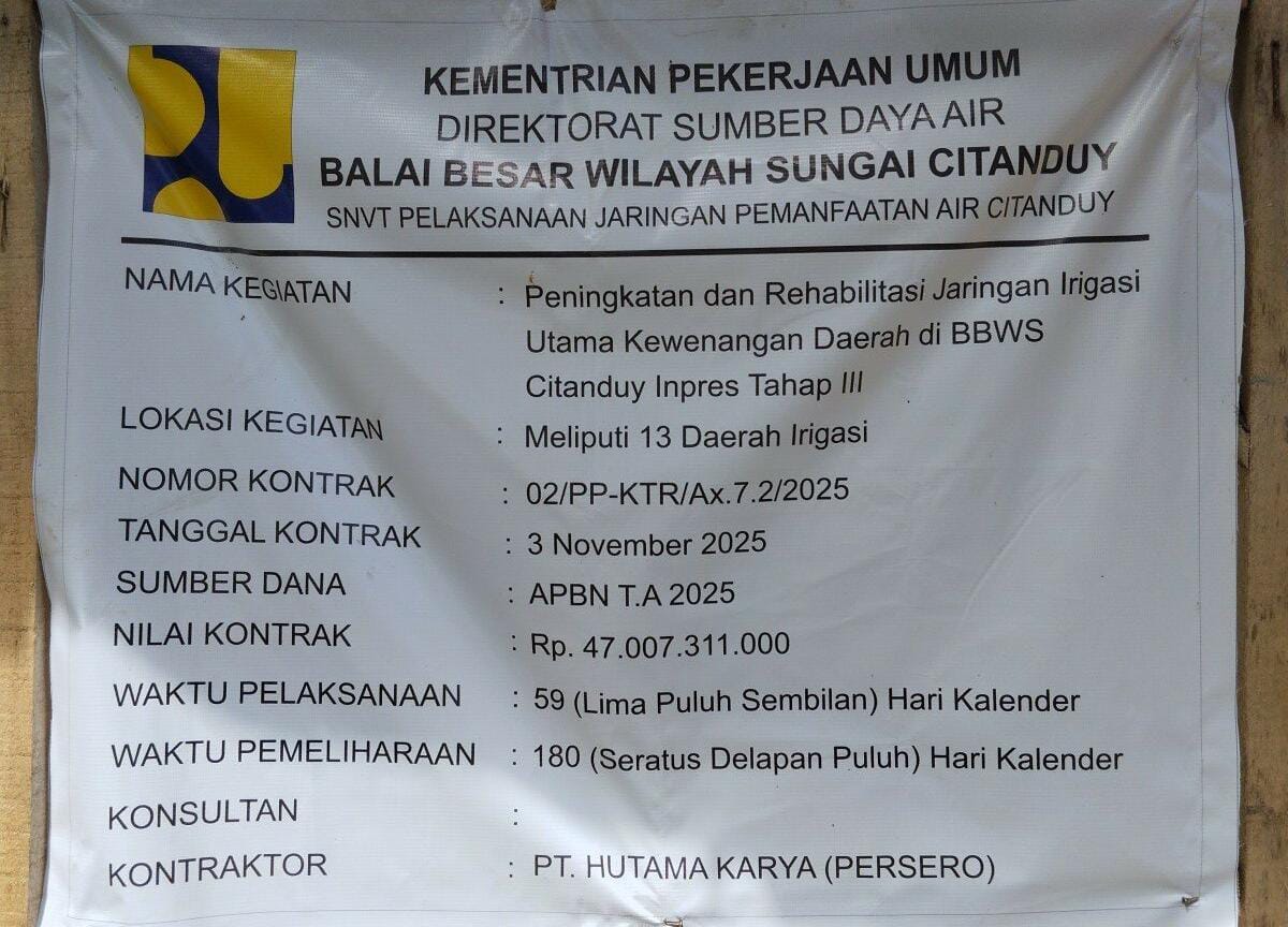 Kabupaten Tasikmalaya, Walpisnusantaranews.com — Ketua Forum Tasikmalaya Bersatu (FORTABES), Ryan Nurfalah, menyoroti pelaksanaan program peningkatan dan rehabilitasi jaringan irigasi utama kewenangan daerah yang berada di bawah Balai Besar Wilayah Sungai (BBWS) yang di kerjaan oleh PT.HUTAMA KARYA dengan Pagu Anggaran Rp.47.007.311.000 Tahun Anggaran 2025 yang meliputi 13 Daerah Irigasi di Kecamatan Salawu Kabupaten Tasikmalaya. Kamis ( 15/01/2026 )