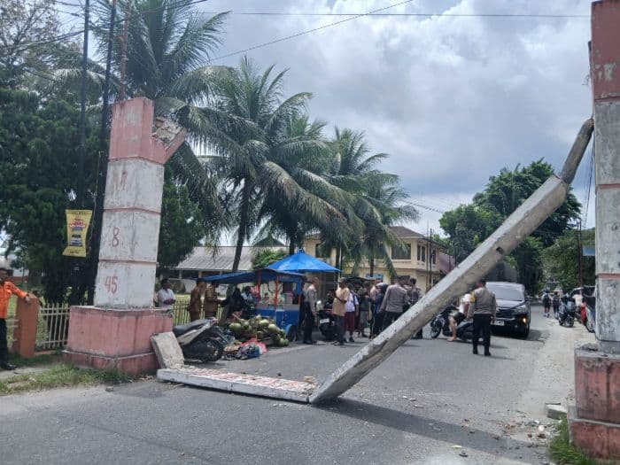 “Personel piket Gakkum telah turun ke lokasi untuk melakukan olah tempat kejadian perkara (TKP) serta mengumpulkan data, bukti, dan keterangan saksi. Dari hasil awal, bagian atas pintu gerbang tersenggol bagian belakang truk, kemudian materialnya jatuh dan menimpa pengendara sepeda motor,” ujar Syah Edi.